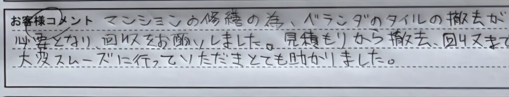 「マンションの修繕の為、ベランダのタイルの撤去が必要となり、回収をお願いしました。見積もりから撤去、回収まで大変スムーズに行っていただきとても助かりました。」