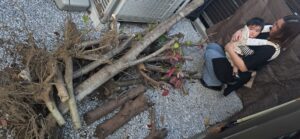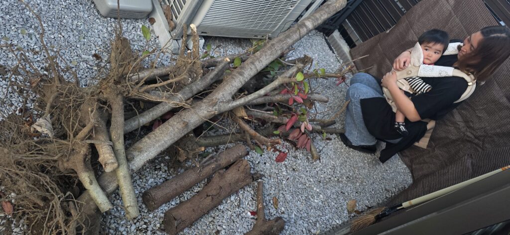 お庭には伐採した太い幹、細い枝葉、土のついた根っこがしっかりまとまって置かれており、フェンス沿いにはレンガ類も残っていました💦見た目以上に重量があり、これを何度も運ぶのはかなりの重労働です😵💫お客様とお子様にもお写真にご協力いただき、明るい雰囲気の中で撮影させていただけました😍ありがとうございます❤️