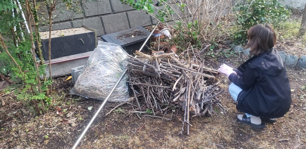 剪定した枝木の束、枯れ草の入った袋、古い物