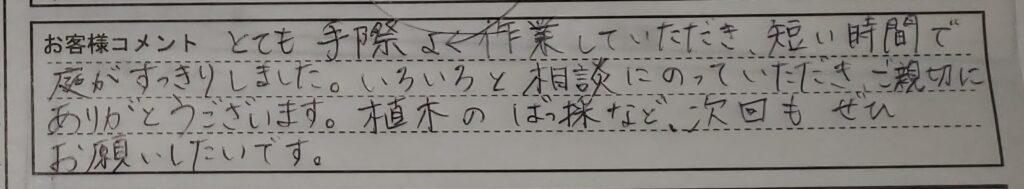 「とても手際よく作業していただき短い時間で庭がすっきりしました。色々と相談に乗っていただきご親切にありがとうございます。植木のばっ採 など次回も是非お願いしたいです」