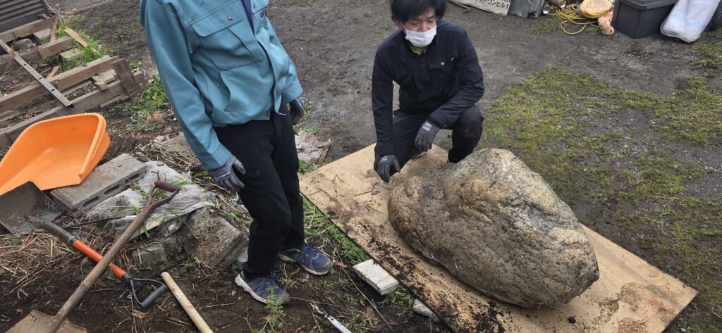石は推定500キロ〜600キロクラスで、もちろん手ではびくとも動かず、しかも土に埋まっているため、まず掘り起こすところからスタートしなければなりません😱