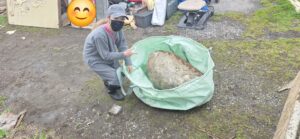 、特大フレコンパックに石をなんとか押し込んで入れて、トラックのフックにロープを引っ掛けて、牽引して石を積み込みます!